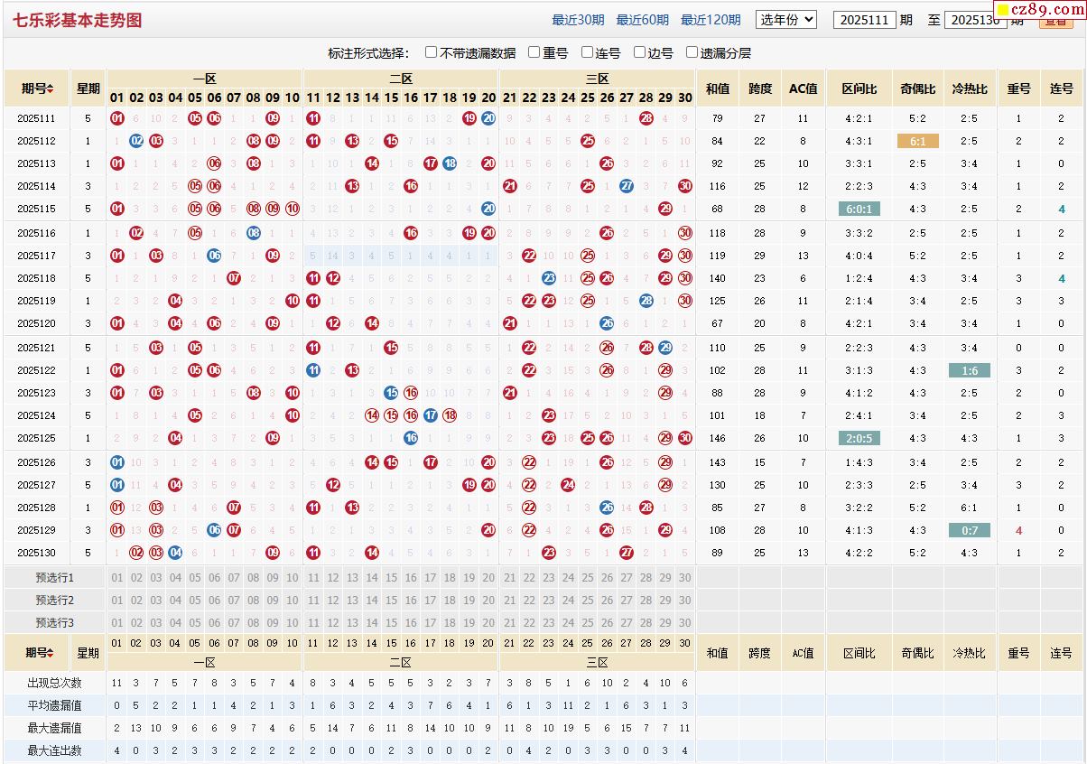 > 2025年131期福彩七乐彩近期走势图分析
